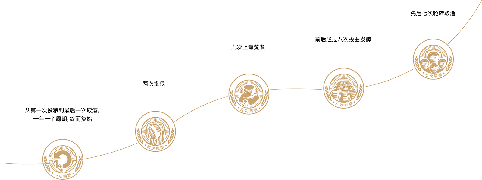 1年周期,2次投粮,9次蒸煮,8次发酵,7次取酒,端午制曲,重阳下沙....